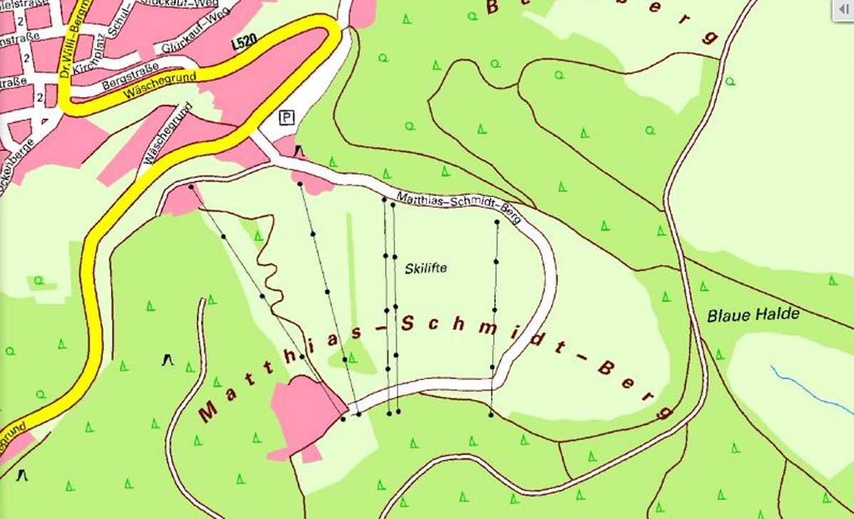 Skipisten: Matthias-Schmidt-Berg, Gesamtlänge 3200 m, Höhenunterschied 80- 140 m, Schwierigkeitsgrad 1, -2 km leicht,1 km mittel,1 km schwer. Zur Vergrößerung anklicken Skigebiet Sonnenberg, Gesamtlänge 1200 m, Höhenunterschied 100 m, Schwierigkeitsgrad 400 m leicht, 800 m mittel.