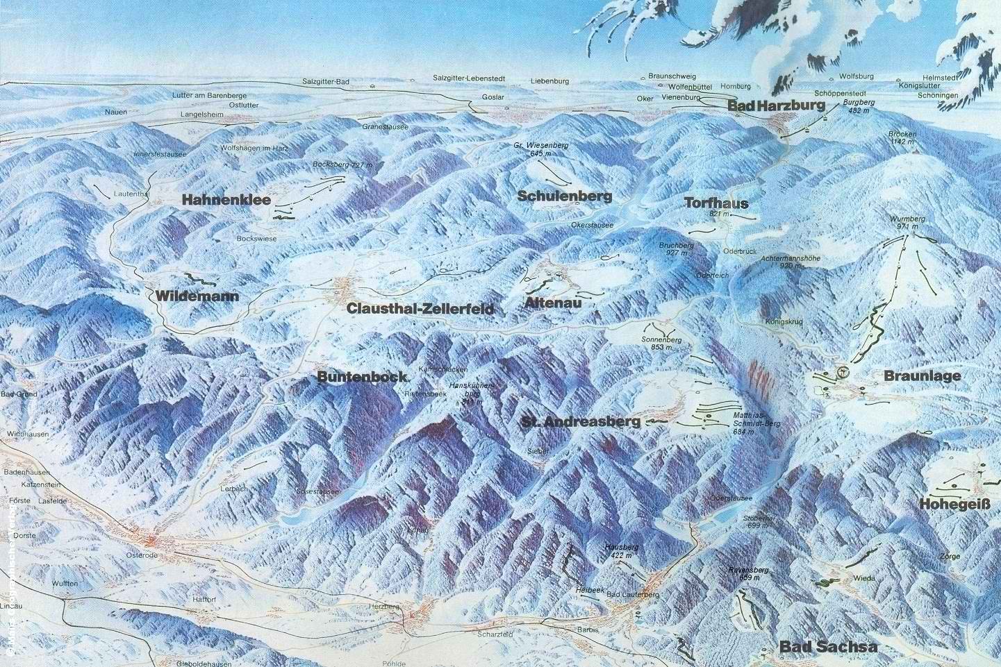 Sankt Andreasberg bietet Skisportmöglichkeiten in Form eines großen Loipennetzes, das sich bis weit in den Nationalpark erstreckt. Langläufer finden besonders im Rehberggebiet schneesichere Loipen vor. Alpinskifahrern stehen mit dem Skigebiet am Matthias-Schmidt-Berg sowie den Skihängen am Sonnenberg abwechselungsreiche Pisten zur Verfügung. Harzpanorama (zur Vergrößerung) Loipenplan (zur Vergrößerung)